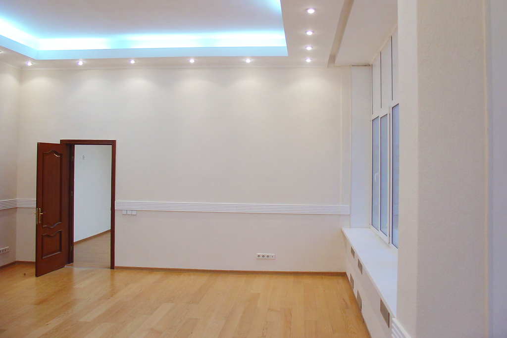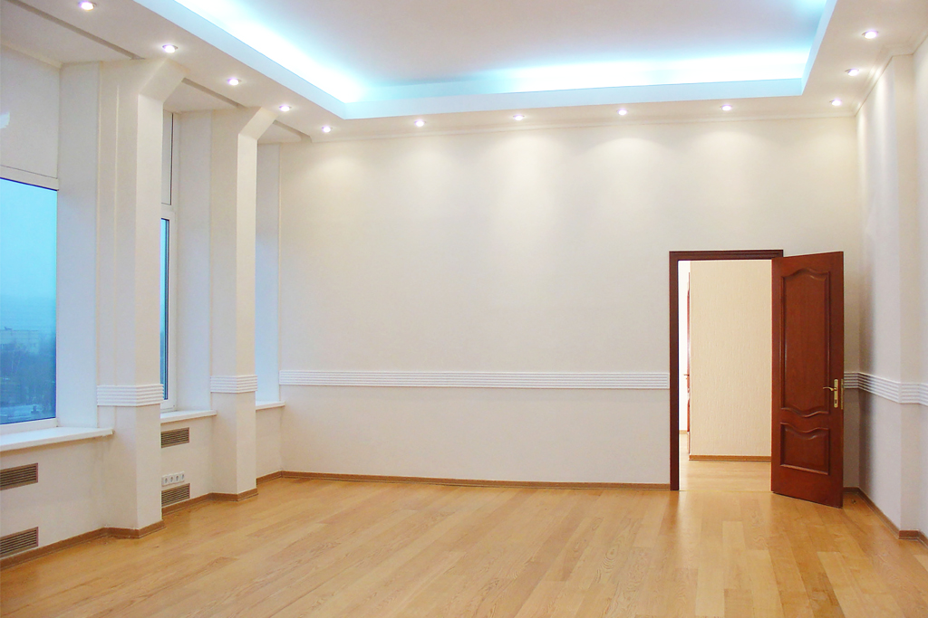 Отделка: ламинат, фактурные обои, многоуровневый потолок